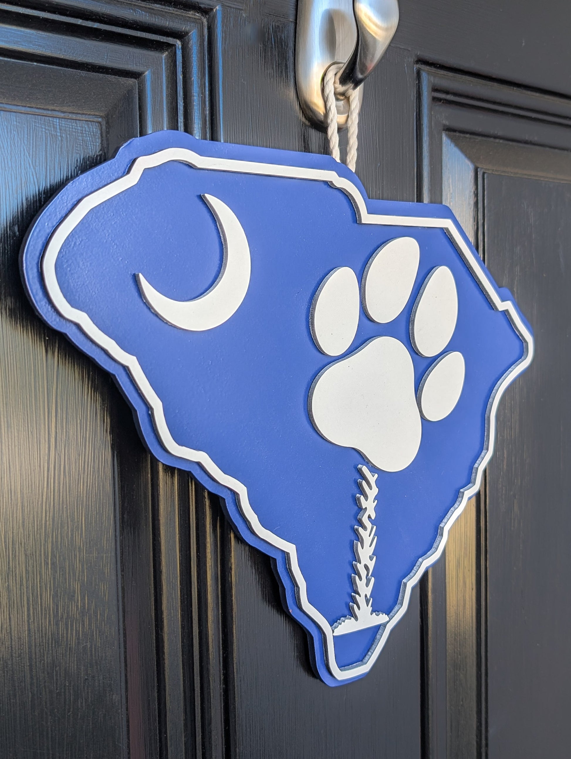 SC State state-shaped door hanger, but with a dog paw as the top of the palmetto tree. SC blue with white.
